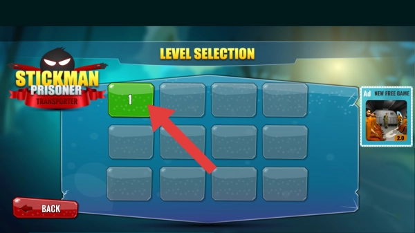 “LEVELSELECTION”对应的是关卡选择界面,其中绿色的“1”标识着当前可游玩的第一关。玩家只需点击这个关卡方块,就能进入对应的关卡场景,开启运输囚犯等任务的体验。这是一款以火柴人为题材的运输模拟类游戏流程。