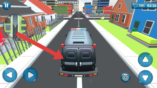 玩家需要操控车辆,按照规则运送囚犯,完成各关卡的任务。这是模拟驾驶与运输类的玩法,玩家通过虚拟按键(比如左右箭头、加速键等)来控制车辆的移动,要在限定时间(03:56)内完成目标。