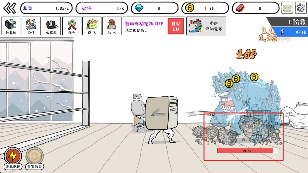 战斗过程中,我们得通过持续点击屏幕,操控电脑人对右侧的蓝色怪物展开不间断攻击,凭借输出慢慢消耗它的血量。