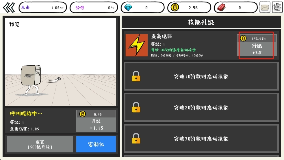 进入技能界面后,消耗金币点击“提高电压”旁边的升级按钮,这样就能提升每秒攻击次数,强化输出能力,为后续战斗做好准备。