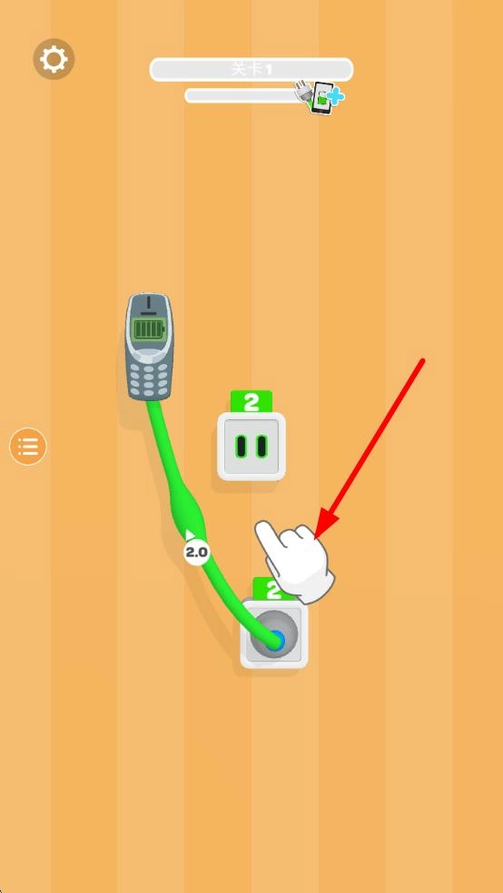 注意到手机充电线和插座后,把充电插头拉向标有数字2的绿色插座,做好初步连接,启动充电程序。