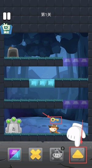 层层剥落之后,我们得操控狐狸去收集黄色钥匙,点击下方的黄色三角形按钮,帮助狐狸跳跃拿到钥匙开门哦。