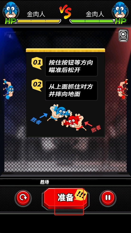 进入对战前,建议先熟悉提示操作:按住按钮可调整方向进行瞄准,时机合适时松开按钮,尝试从对手上方将其抓取并摔向地面,以此触发有效攻击。