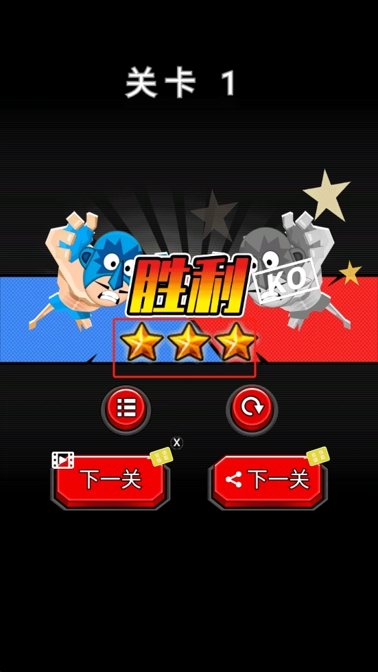 关卡1获胜后,界面呈现三星评价。点击下一关按钮,沿用之前的对战策略,继续挑战后续关卡,力求以高评价通关。