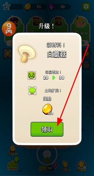 升级后会解锁白蘑菇这类新材料,同时还能提升容量、扩大土地面积,完成升级操作后,点击领取按钮就能获得相应奖励。