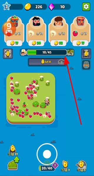 界面设有经验条,玩家可通过收集作物、进行升级等操作来积累经验值,从而提升等级,解锁并扩展更多农场相关内容。