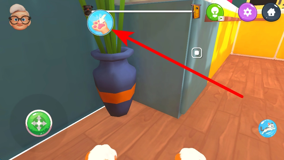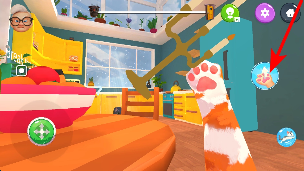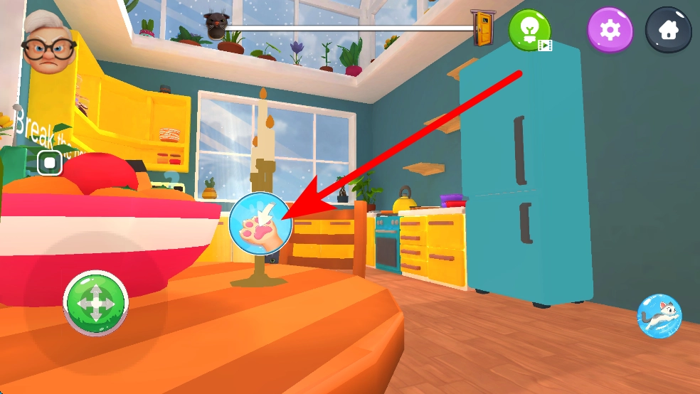 接下来,你还能找找其他能互动的东西,像桌上的小摆件之类的,再点一下操作按钮,就能让猫咪对这些物品做些搞怪的动作,把它们都弄倒。