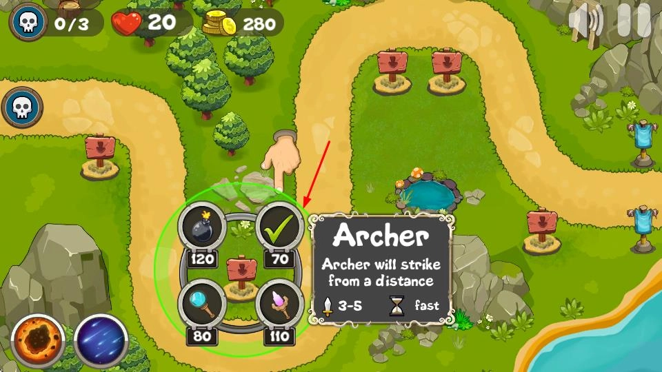 在怪物行进的路径旁边,花费金币来挑选并建造防御塔,随后点击确认进行部署。