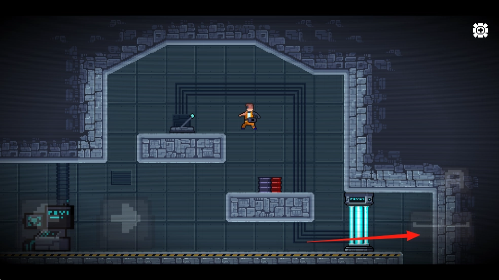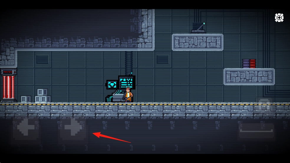 进入游戏场景后,通过左下角的方向按键,控制角色在工业风格的场景中移动和探索。