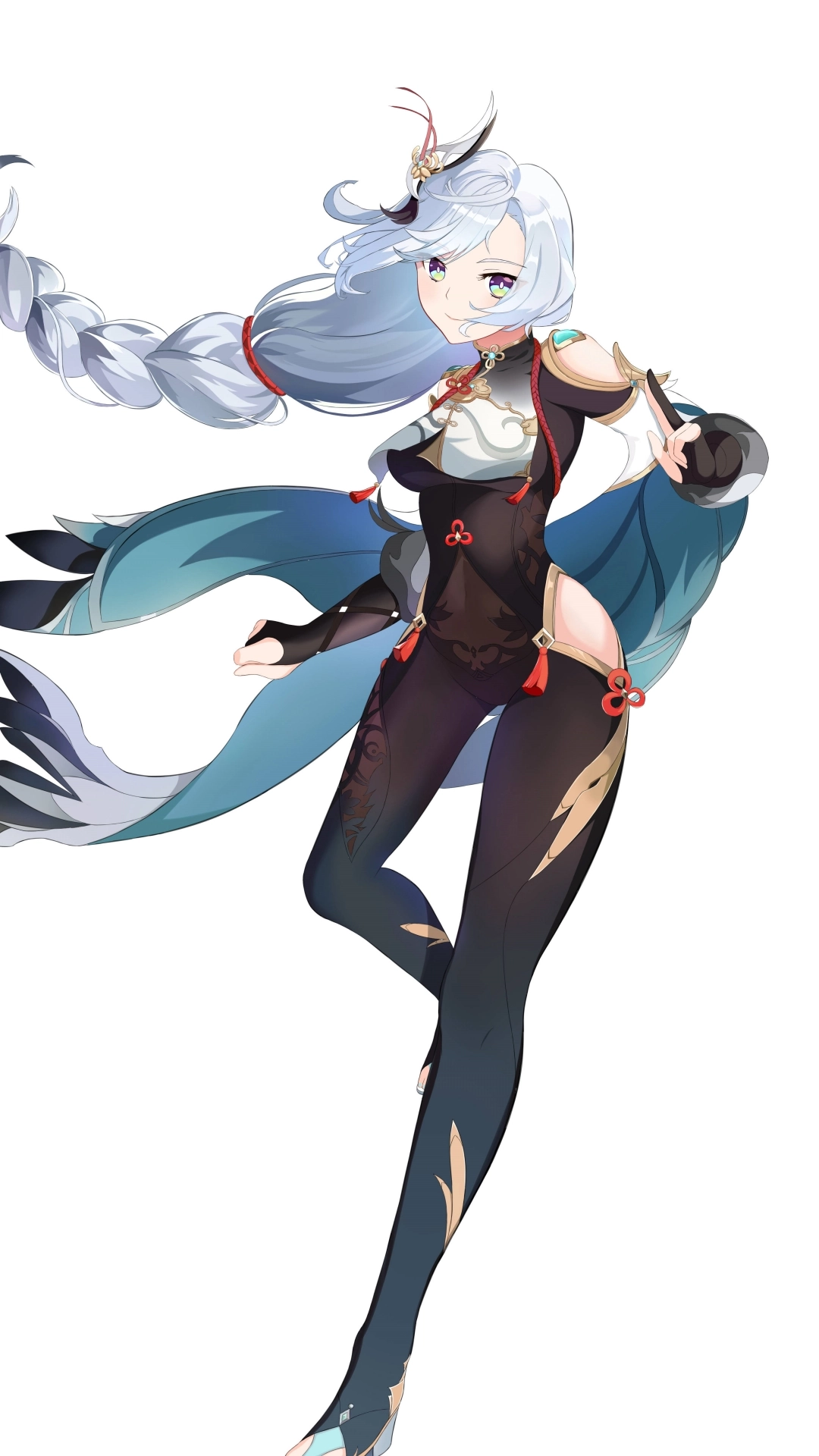 外貌:白发红绳装饰,青色服饰,眼神清澈,气质清冷,手持降魔杵。