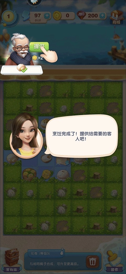趣味合成和经营结合的简单玩法,轻松上手,指尖操作就能合成美食、完成顾客订单,轻松赚取金币修复餐厅,休闲养成无压力,全程不卡关!