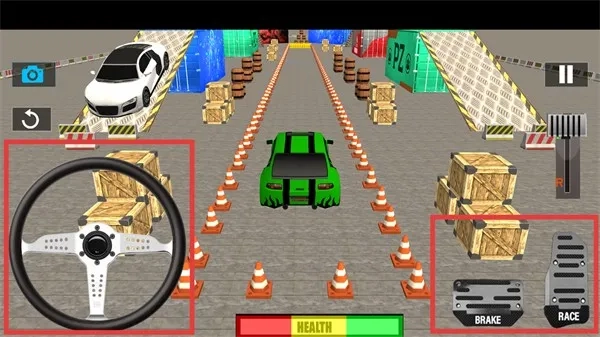 通过左侧的方向盘以及右侧的【BRAKE】【RACE】踏板,来操控绿色汽车在障碍物之间行驶。