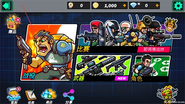 2、进入游戏主界面后,可选择战役模式开启关卡挑战,也能通过赠品、签到按钮获取资源。