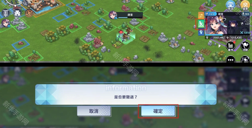 行军中选择【撤退】会返还 10 点体力,英雄体力每三分钟回復 1 点,体力量显示在英雄头像的右上方,体力不足时将无法行动。