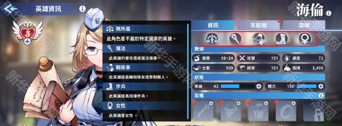 指挥官可以透过【英雄】系统进行英雄和装备的配置,每位英雄都有不同的属性定位和天赋技能,根据英雄属性配置兵团可以让战斗发挥到最大效益,您可以在【英雄资讯】页面的图标确认到各英雄数值。