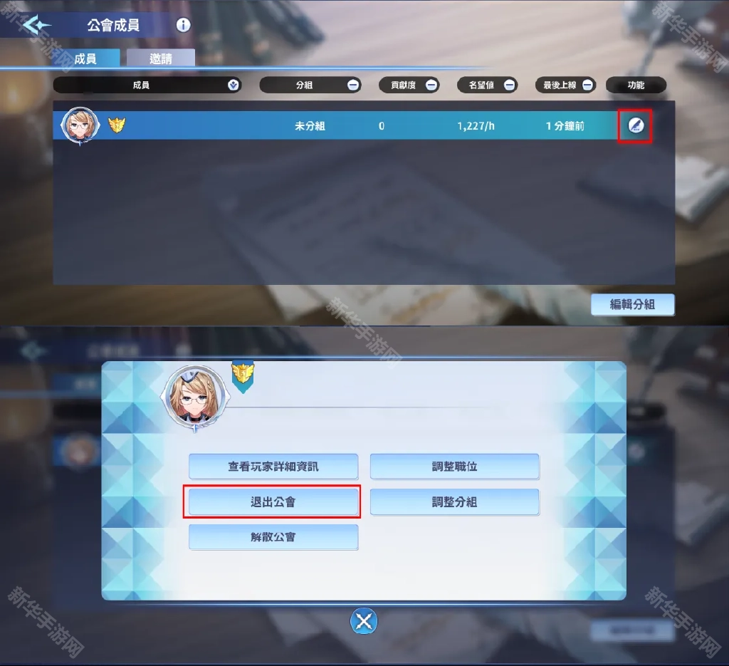 【成员】功能内可以进行势力邀请、会员管理和分组、【退出势力】、查看会员资讯等成员相关操作