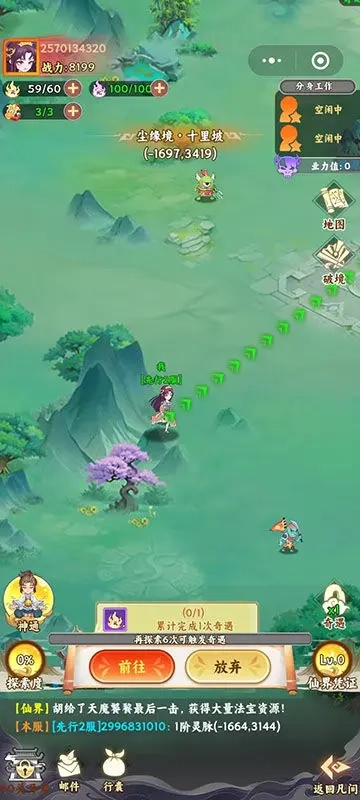 仙境系统分多层幻境,解除封印解锁新区域。灵力消耗触发随机事件,探索积累触发奇遇。
