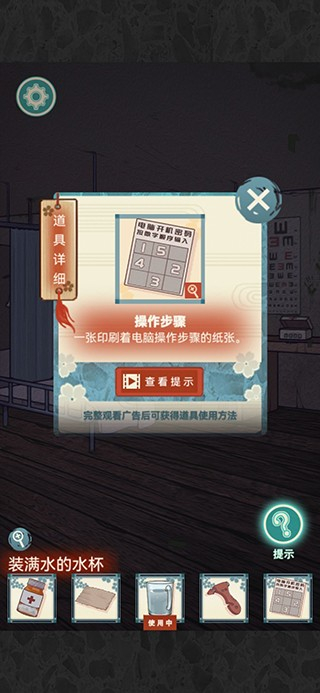 2、根据被涂改过的视力表“左右左下”打开桌子上的医药箱,获得麻布和玻璃药瓶