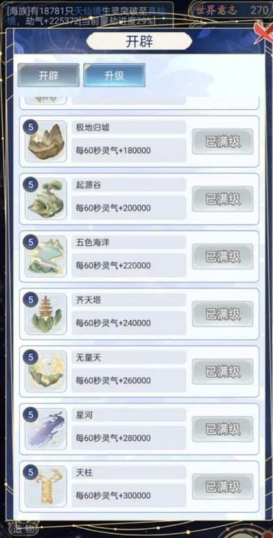 3. 世界升级:战力不足4000万别升中世界;升前攒200本源;世界意志最珍贵,优先用于天道升级。