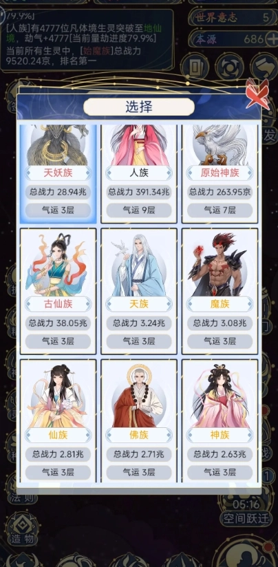 2. 种族培育:通过孕育生灵创造不同种族,品阶随天道等级提升;启示生灵添加强者;福泽选项提升种族境界;诸神之战选择战力最高种族参赛,获取奖励。