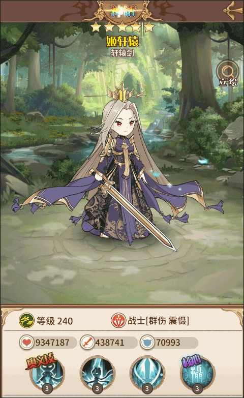 技能“剑魂”提升暴击伤害时增加自身攻击;奥义技“剑指山河”对全体敌人造成高伤害,击倒低攻击力目标。