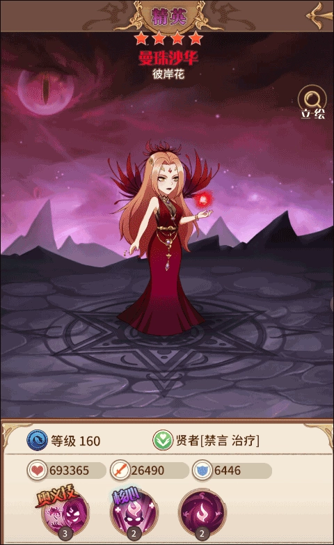 技能“三途缘”回复队友血量;奥义技“黄泉引”限制敌人释放大招,消失时造成范围高伤。