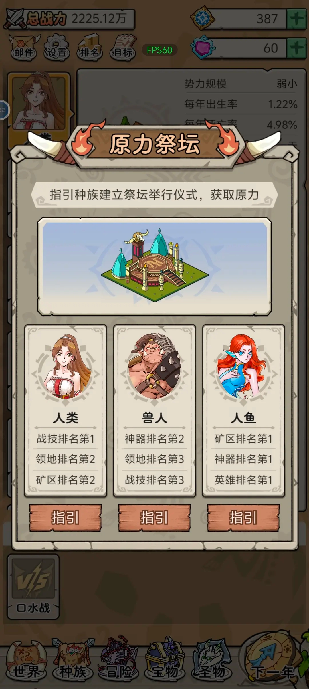 初始阶段根据指引操作,每年触发随机事件影响种族发展。