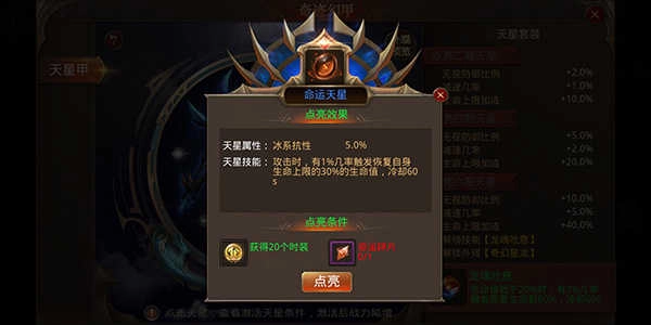 天星技能:攻击过程中,存在1%的概率触发效果,恢复自身生命上限30%的生命值,该效果的冷却时间为60秒。