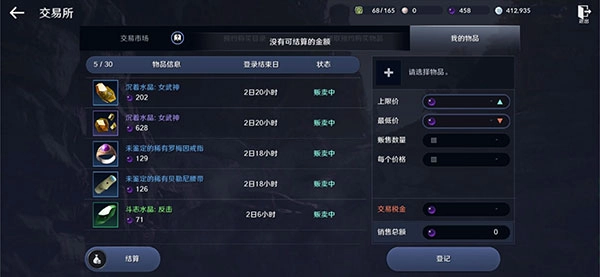在交易所登录的道具共有四种状态,分别是[等待贩售/贩卖中/贩卖结束/结束登录],而处于[贩卖中]状态的道具支持取消贩售操作。