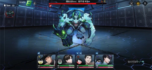 1)主c没有累积到大招,先集火左右小怪,然后再集火boss,由于输出不够,必定是会熬到boss开大回合(第9/10回合,我现在输出够高,可以提前击杀boss了)此时需要限定卡在boss开大前开启主动技能获得反击。主c一定要比限定卡体力高,这个游戏ai会追残,养成低的会被boss击杀,这样boss一定会先杀限定卡触发反击补伤害,然后主c收尾。
