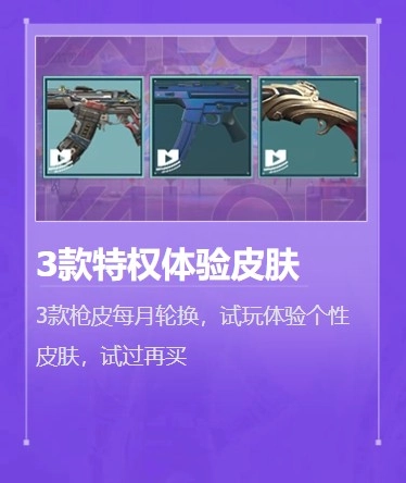免费皮肤体验活动:玩家每月可体验三款不同的精选武器皮肤,便于在试用后再决定是否购买。