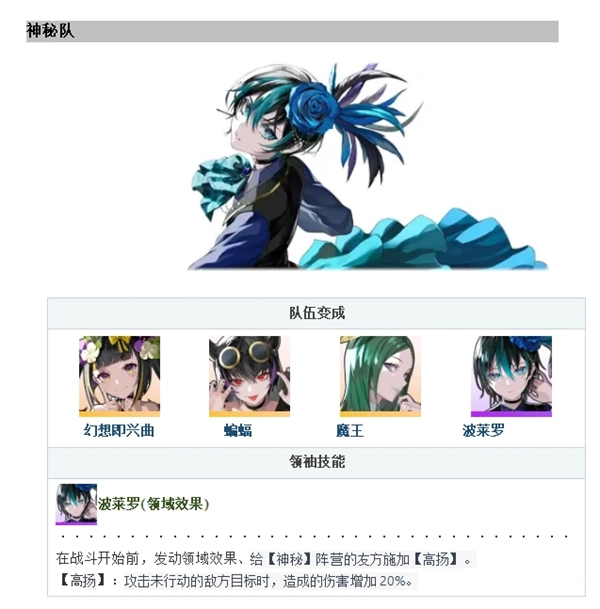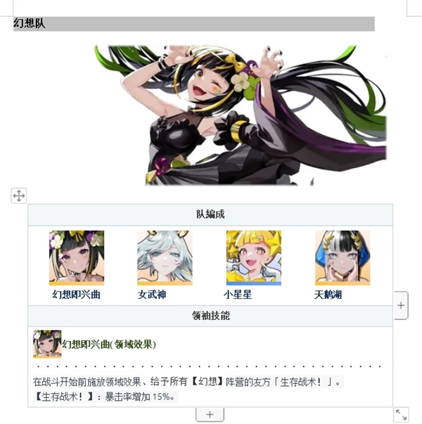 这是一套以幻想即兴曲的领袖技能提升暴击率,再通过幻想即兴曲与天鹅湖配合打伤害的组合。女武神和小星星则能在一定程度上强化队伍的持续作战能力。