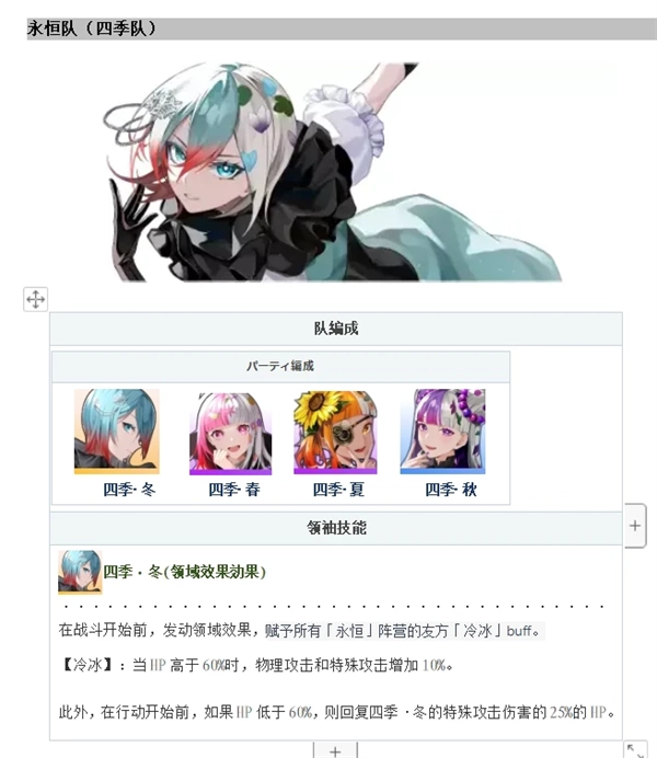 拥有四个「四季祝福」的四季?冬,其技能1能够为全队带来20%的物理伤害提升效果,所以在战斗过程中,需要保证四季夏与四季?冬的「四季祝福」层数得到有效积累。而四季层数的叠加,主要依赖于四季·秋的技能1来实现。