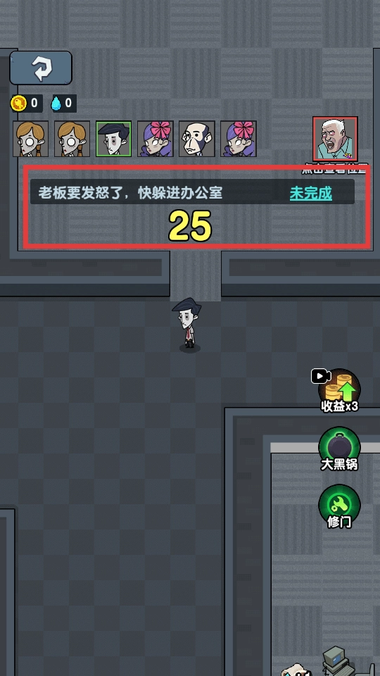 2、注意“老板要发怒了,快躲进办公室”的提示,在倒计时结束前控制角色移动到办公室,躲避老板的怒火。