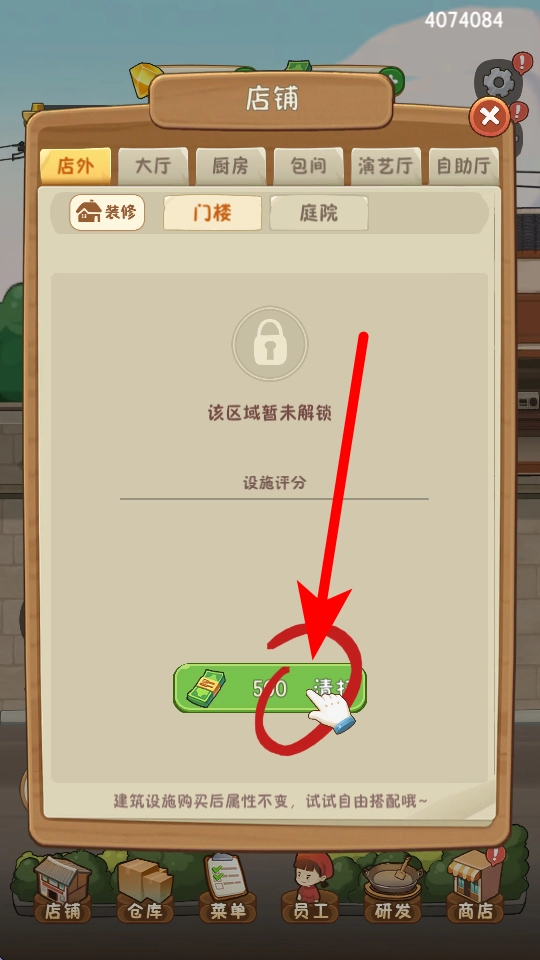 进入店铺界面后,在店外区域找到带有绿色标识的清扫按钮,点击该按钮即可对相应区域执行清扫操作。