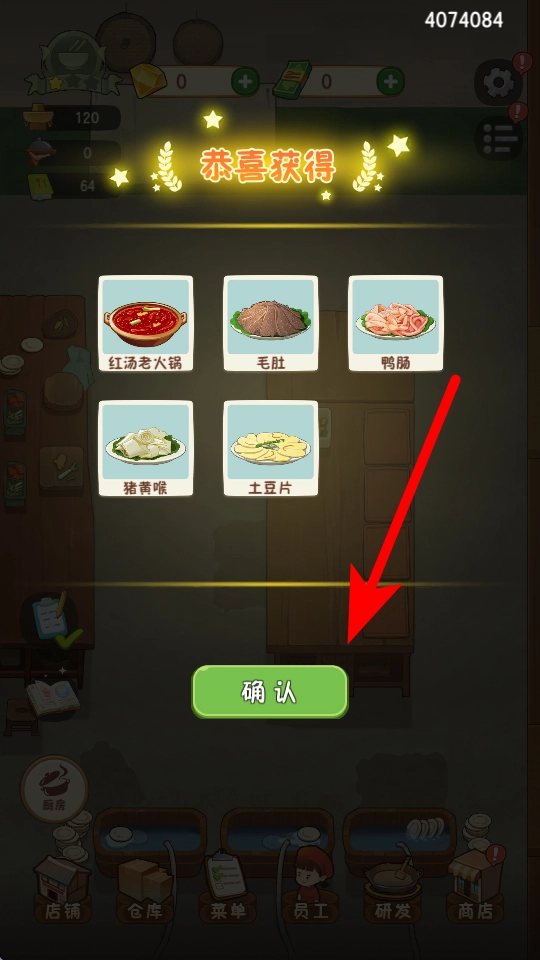当获取新菜品时,界面会弹出“恭喜获得相关菜品”的提示,点击确认按钮即可完成该流程。