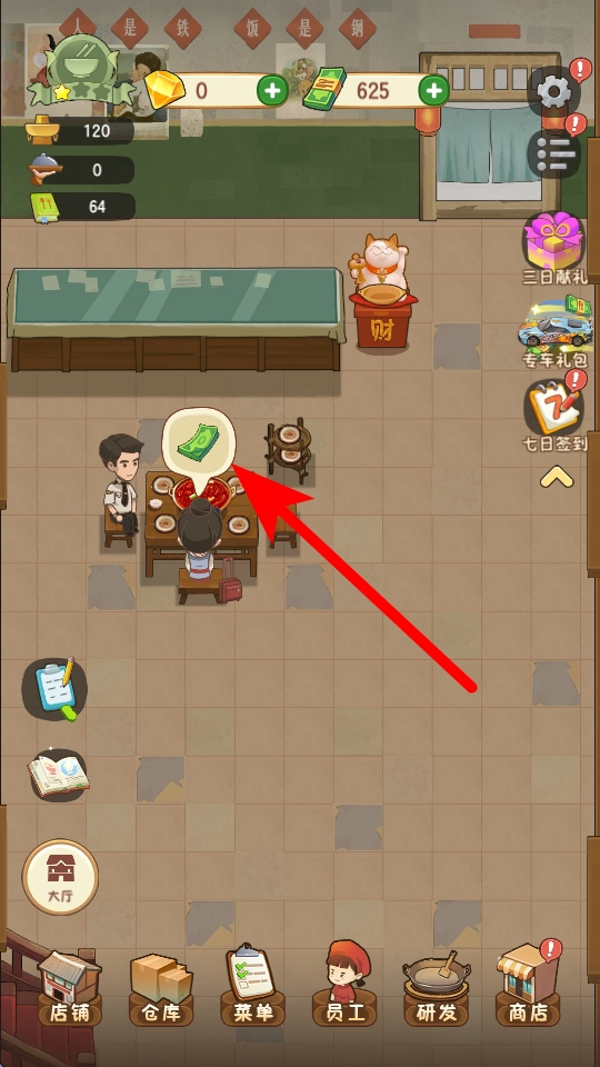 在大厅场景中,当顾客完成用餐后,界面上会弹出钞票图标,玩家只需点击这个图标,就能得到相应的游戏货币。
