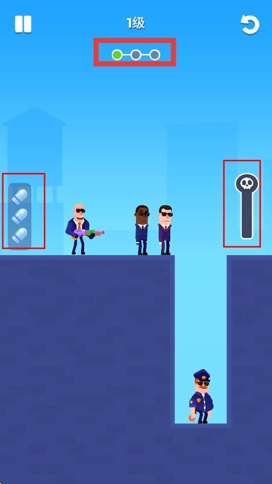 进入关卡后,通过滑动来控制手枪的发射方向,瞄准并射击前方的敌人,把敌人击倒,从而完成关卡任务。