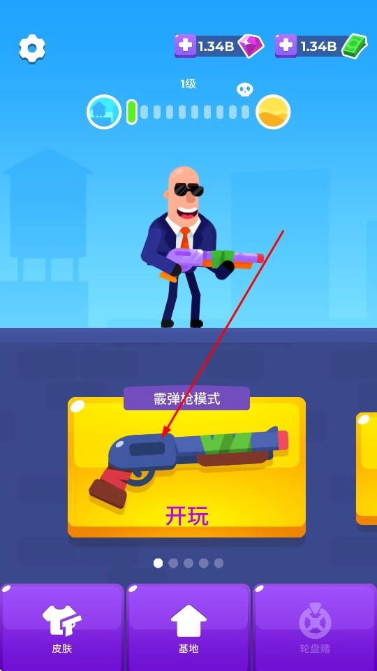 进入游戏主界面后,点击“开玩”按钮,在模式选择中找到枪械模式并选中,就能开启射击关卡了。