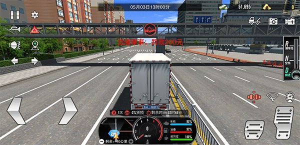 在运输过程中,玩家需借助下方地图导航前往运输终点。途中请务必系好安全带(其对应刹车上方的红色图标),同时要遵守交通规则,避免发生撞车等事故。一旦违规或撞车,不仅会被罚款,还会导致货物损坏。