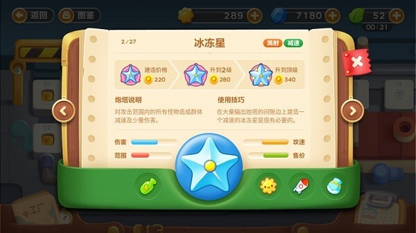 使用技巧:在密集布置输出炮塔的间隙处,建造一座具有减速效果的冰冻星是很有必要的。