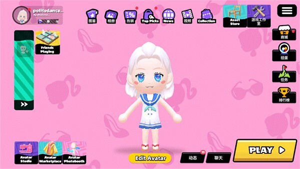 进入游戏主界面后,你可以在此处进入商城、浏览排行榜、查看相关任务等;若要进入游戏项目界面,点击“play”即可。