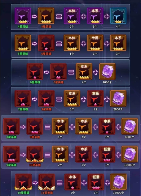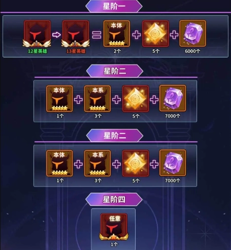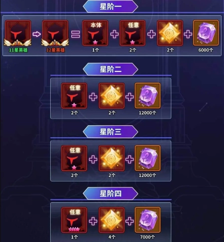 想要组建一套强力阵容,光靠英雄本身还不够,还得把英雄的星级提升上去。英雄升星需要消耗大量同系狗粮和英雄本体,在前期资源有限的情况下,提升星级的高效方法之一是每一系都培养1个英雄。这样能快速让所有英雄达到6星,之后再挑选狗粮和本体储备较多的一系作为主力输出,前期阵容就能基本成型了!下面为大家列出各星阶所需的材料。