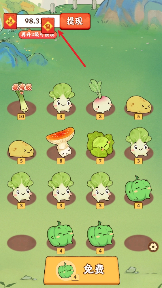进入游戏后,点击下方按钮,系统会依据当前作物的最高等级,随机发放一颗作物。
