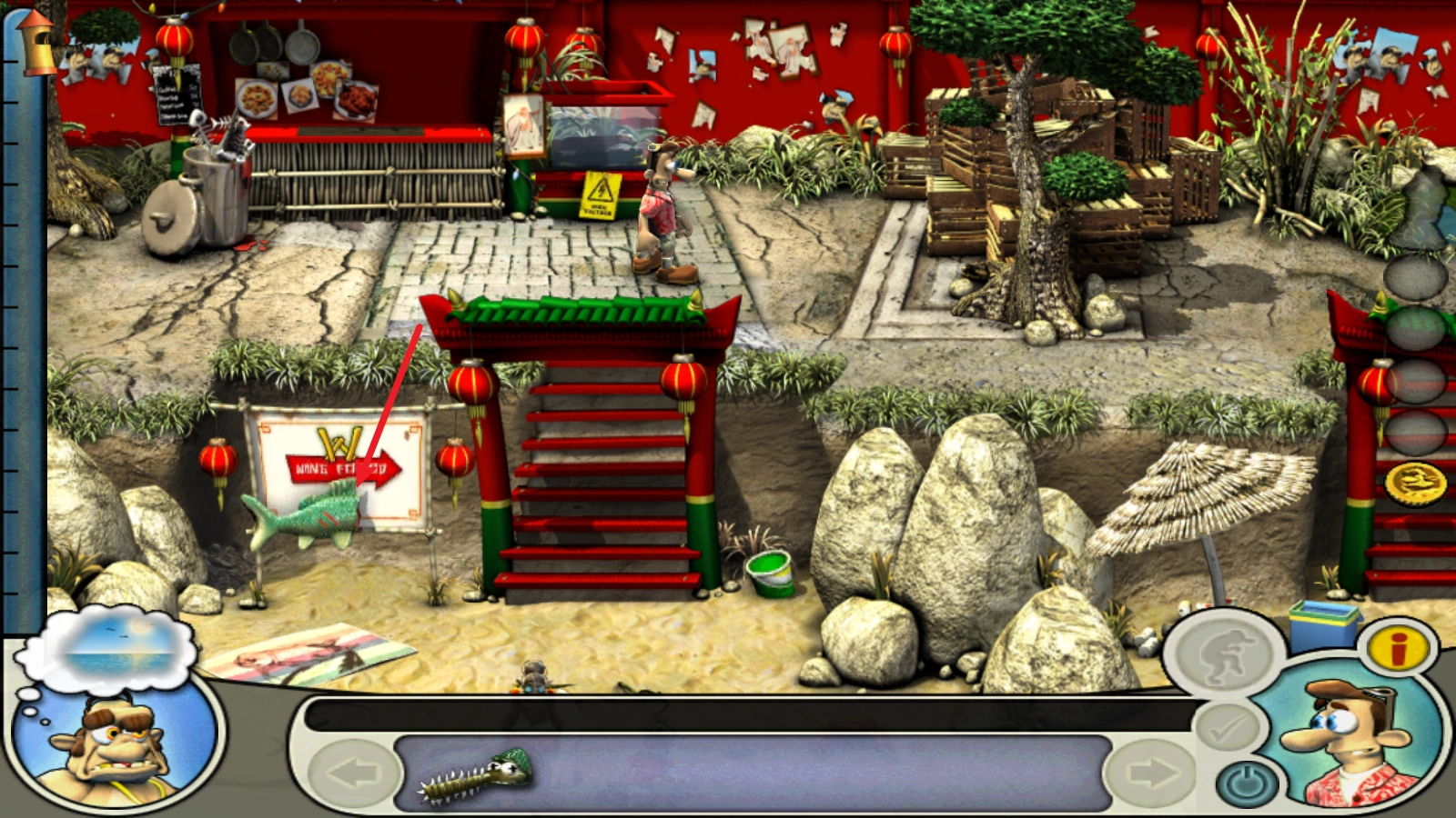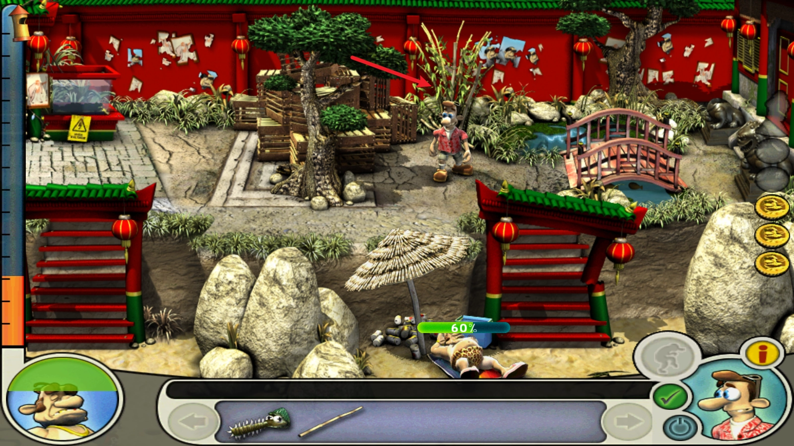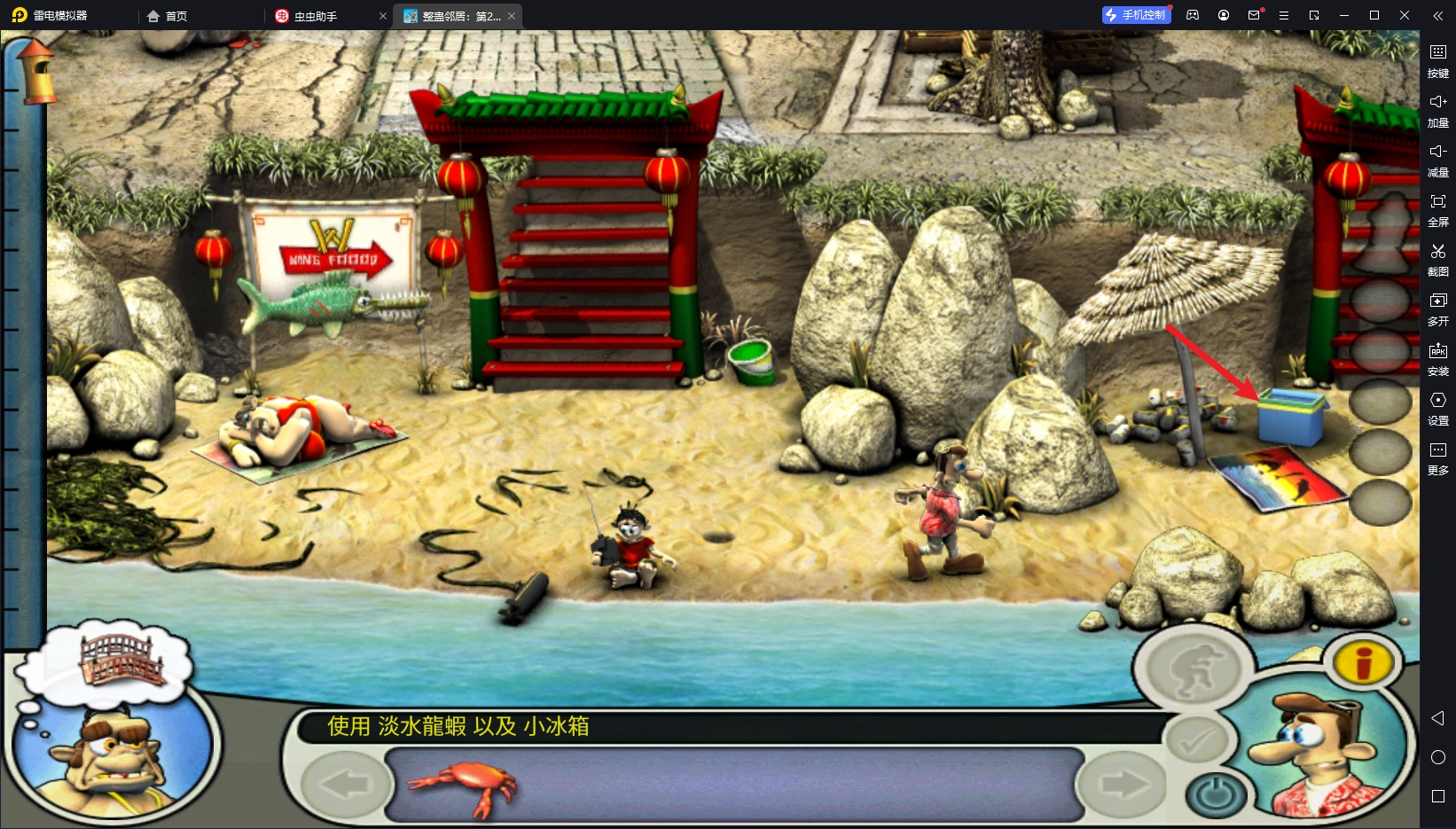 先从右上方的芦苇丛里折一根芦杆,再用它对着左下方的蟹巢进行操作,把挖出的螃蟹放进右下方的冰盒中。