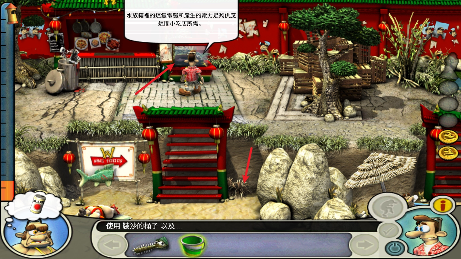 在坐下的区域中找到装沙子的桶,然后用桶装上电鳗。
