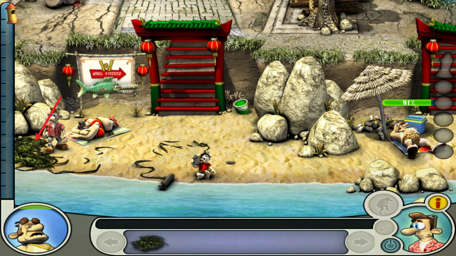 最后一个步骤是先从座位上取来海草,接着把右下方的耙子放倒,再在上面铺上海草。