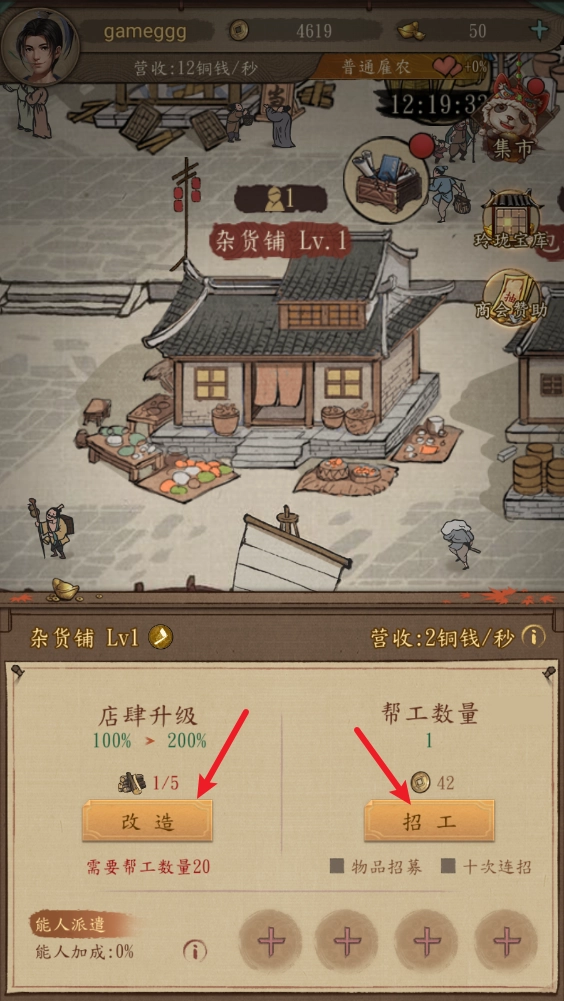 点击商铺能够开展招工操作,也可以选择升级店铺,通过这些方式来提升店铺的收益。