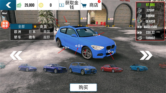 接着点击左右方向的箭头就能切换不同的车辆,最后点击下方的“购买”按钮即可解锁车辆。