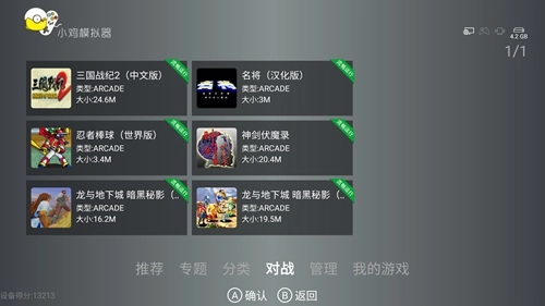 打开小鸡模拟器进入主界面后,能看到画面下方设有6个功能选项,依次为【推荐】【专题】【分类】【对战】【管理】和【我的游戏】,用户可借助电视遥控器或小鸡手柄完成不同页面的切换操作。